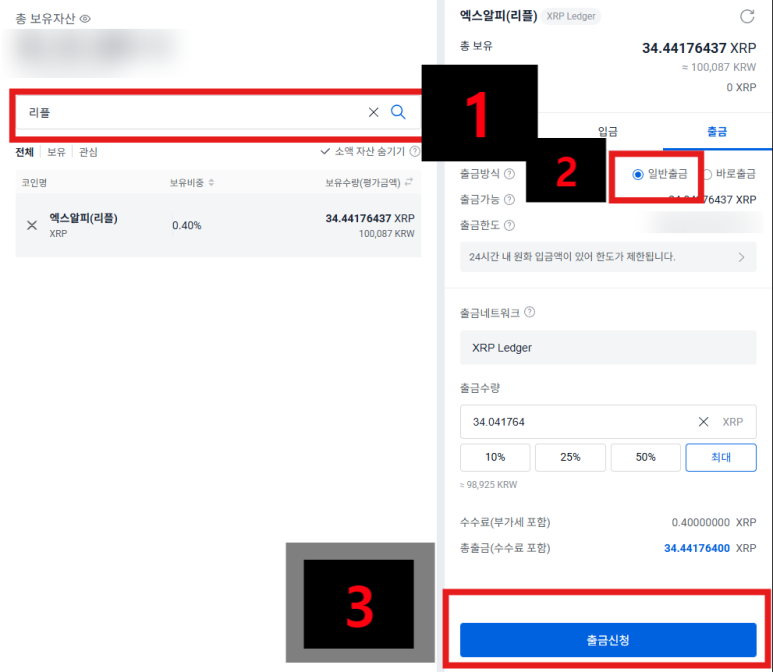 2) 업비트 출금 신청: 업비트 입출금 탭에서 오렌지X 주소를 붙여넣고 출금 신청을 합니다.