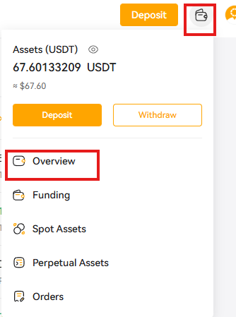 - 우측 상단 [Wallet] → [Overview] → [Transfer] 버튼 클릭.