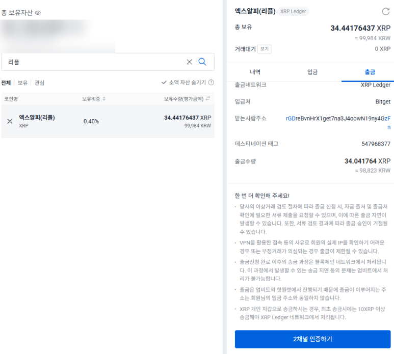 선택 후 주소와 데스티네이션 태그(리플)를 복사합니다.