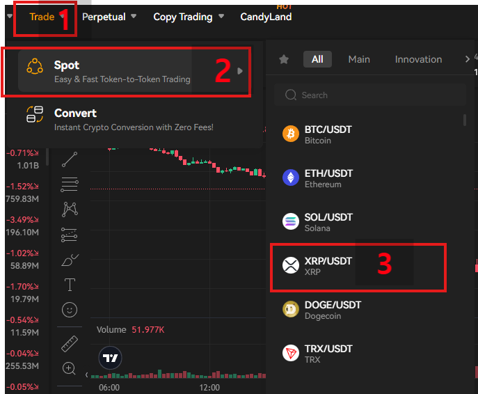 2) 왼쪽 검색창에 XRP 검색 → XRP/USDT 페어 클릭.