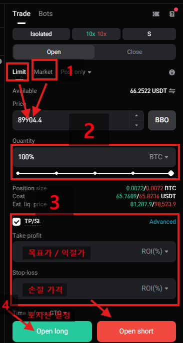 순서대로 ①가격 → ②수량 → ③안전장치 → ④방향만 정하면 됩니다.