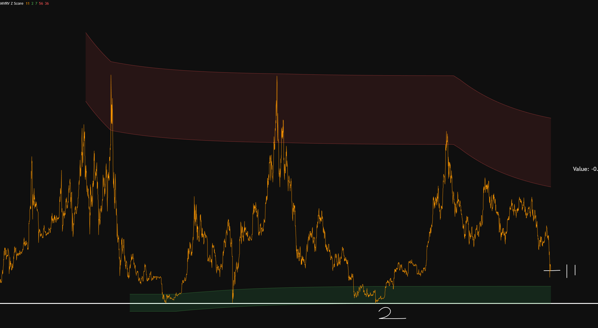 - MVRV 지표: 과거 대세 하락장의 바닥 수치는 2.0이었습니다. 현재 수치는 약 11.0입니다.