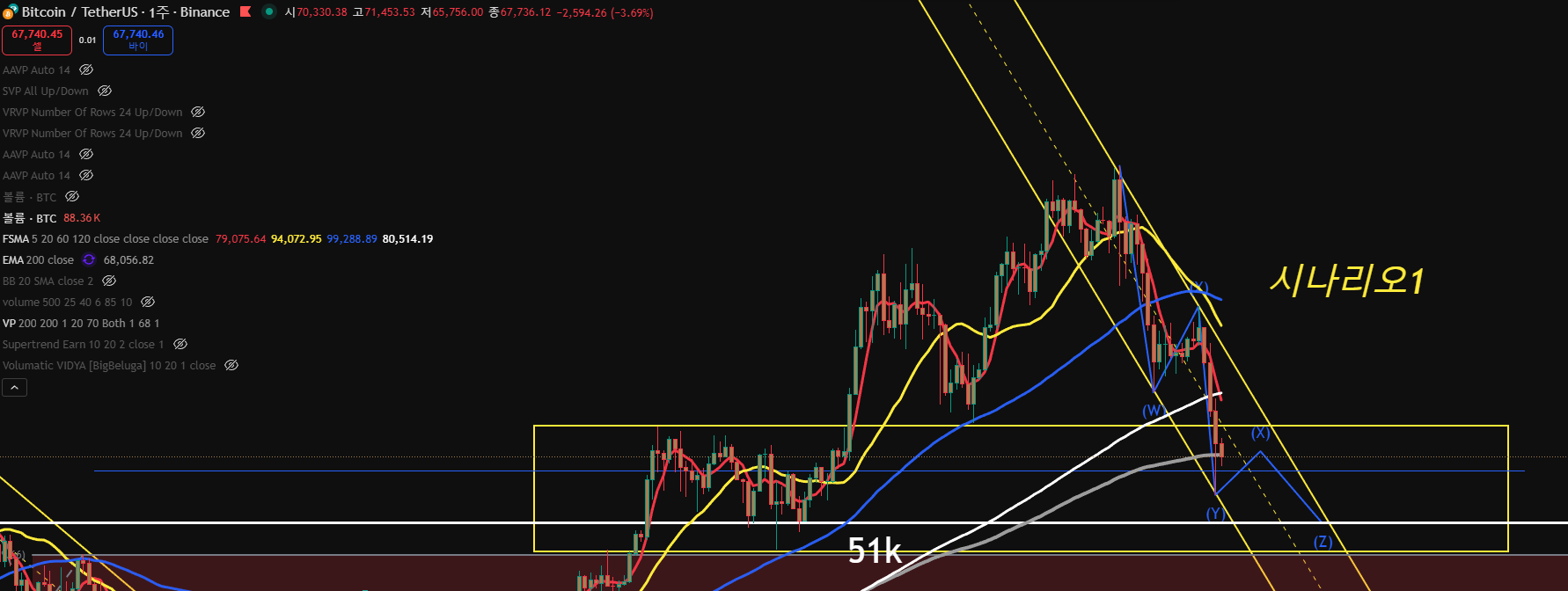 - 최종 지지: 이 경우 마지막 Z파동의 타겟은 피보나치 확장 비율 0.618 지점인 51k(51,000달러) 부근이 됩니다.