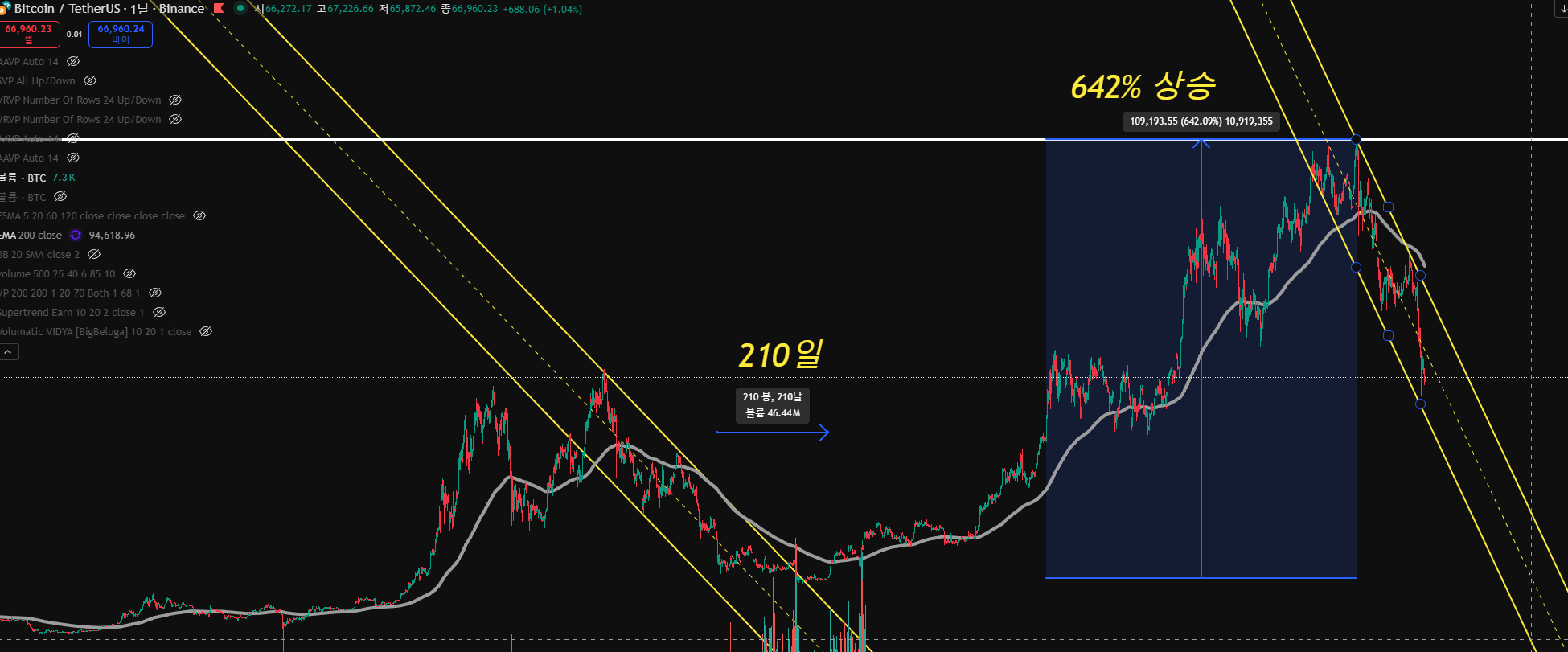 과거 사이클을 복기해보면, 하락장 이후 210일간의 지루한 횡보 기간 동안 바닥권 거래량이 폭발했습니다. 이는 세력의 매집 신호였으며, 이후 비트코인은 600% 상승했습니다. 현재도 기관(마이크로스트래티지, 바이낸스 등)의 매수세가 지속되고 있으며, 비트코인 붕괴 시 미 국채 시장 타격 등 시스템 리스크가 존재하기에 하방 경직성은 확보된 상태입니다.