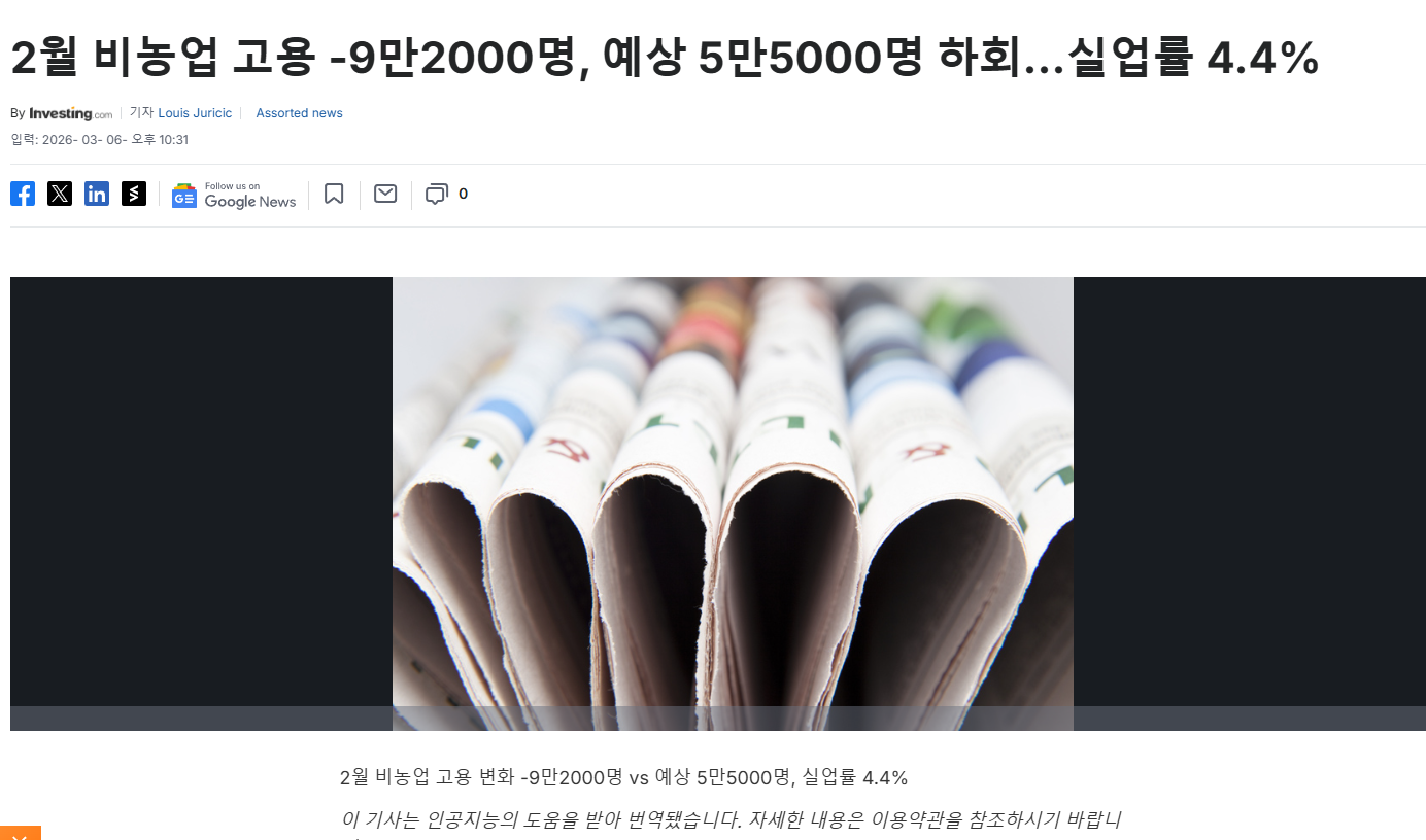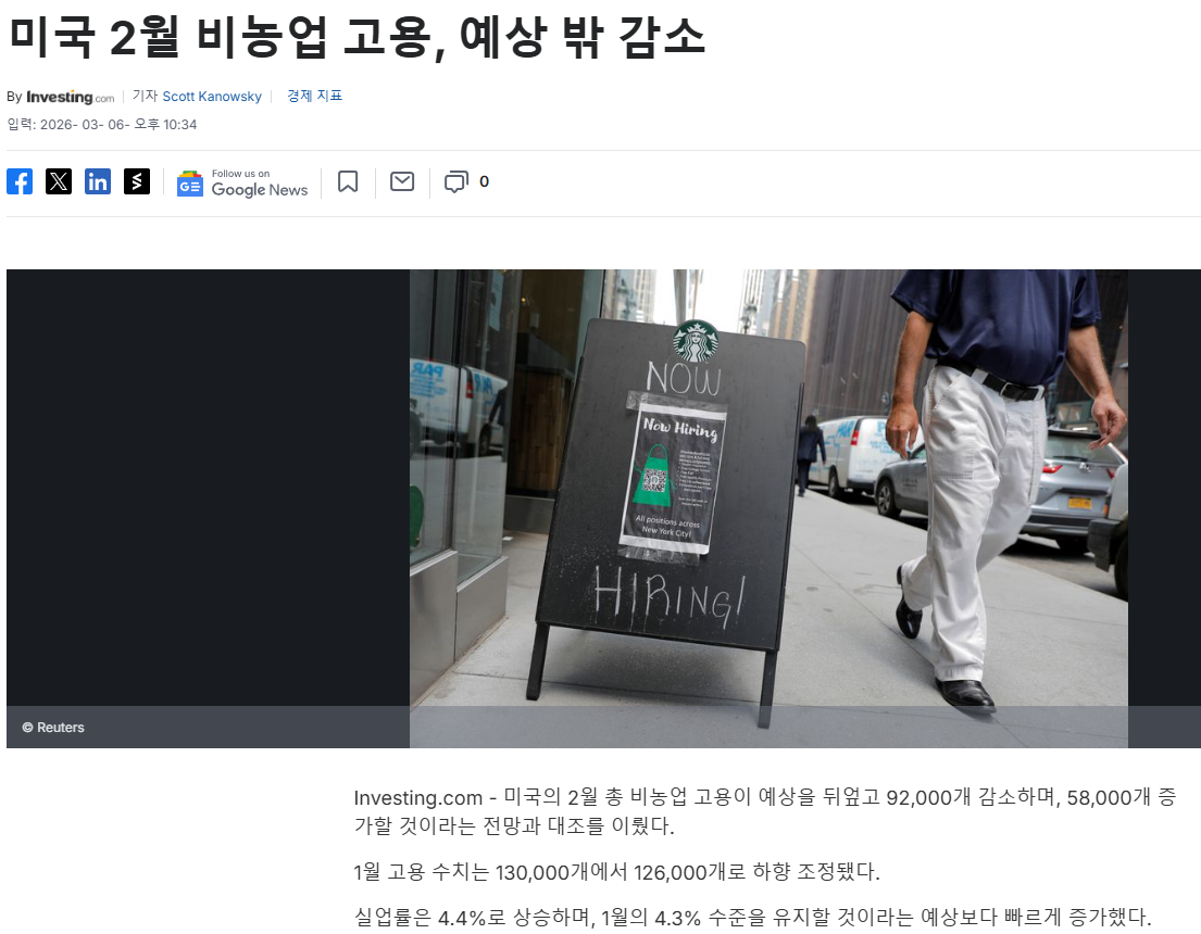 미국의 2월 실업률은 4.4%로 시장 예상치인 4.3%를 상회했습니다.