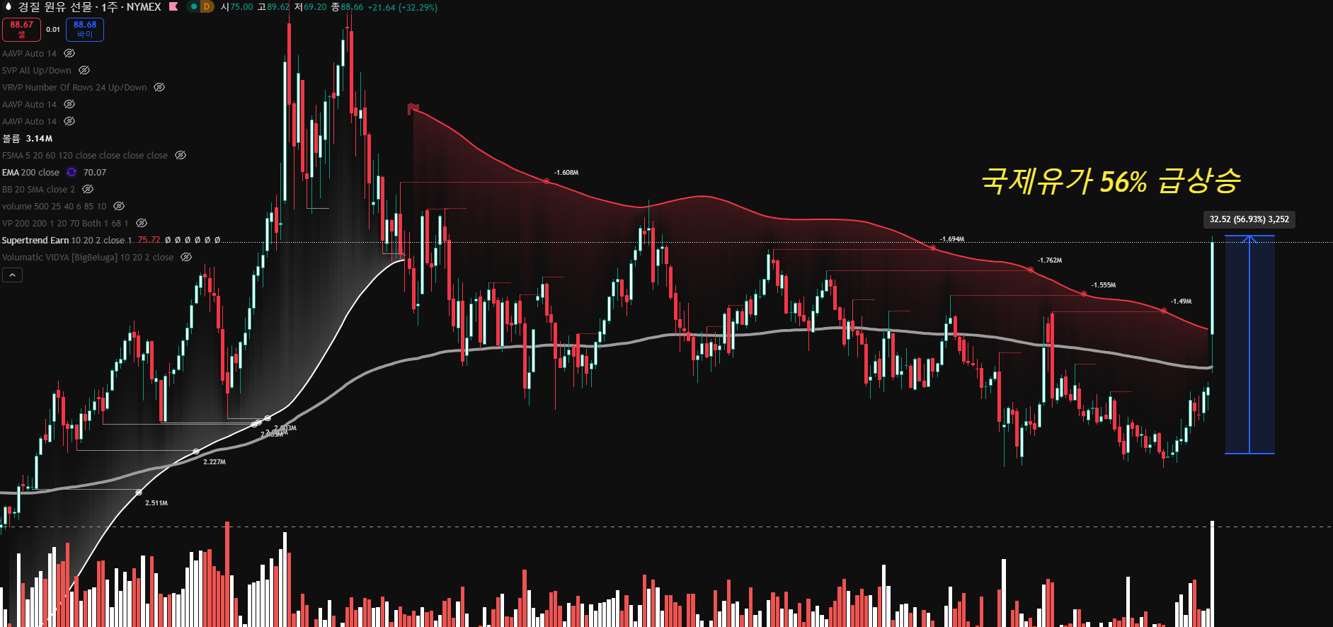 중동 지역의 지정학적 분쟁이 전면전 양상으로 치달으며 서부텍사스산 원유 선물 가격이 30% 이상 폭등했습니다.